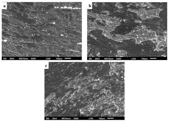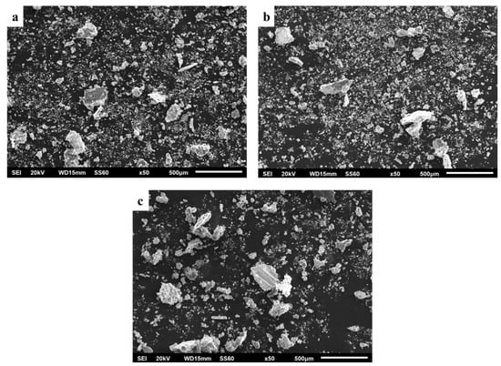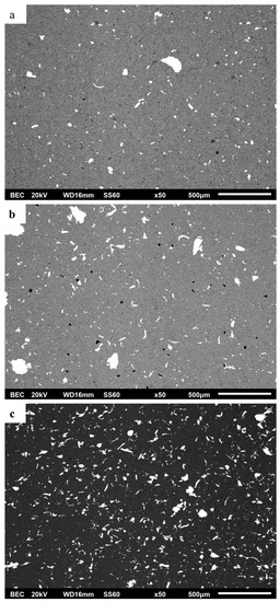 Figure 3a–c shows a panoramic view of the microstructure of the different produced composites after SEM examination under back-scattered mode (BSC mode). Based on these microstructural images, the following points can be addressed.