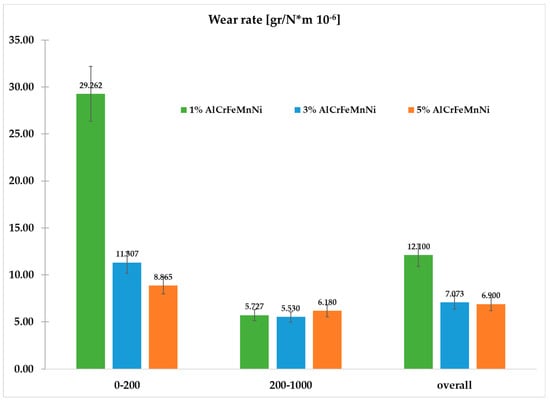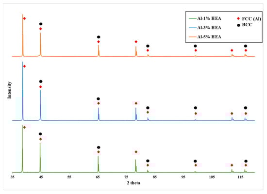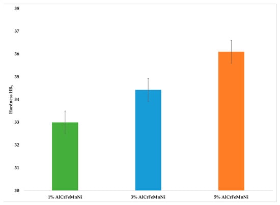 In order to gain more information on the microstructural features of the produced systems, XRD analysis was performed, the results of which are presented in Figure 4. It can be observed that the Al matrix phase can be identified in all the different diffractograms, and the presence of the AlCrFeMnNi particle phase can be observed at some peaks (characteristic of BCC phase).