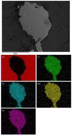 The presence, however, of the HEA reinforcing particles has indeed been verified by SEM-EDX chemical mapping. Figure 6 shows the results of this analysis in the case of the 5 vol.% reinforced composite. Clearly, this elemental analysis shows that the reinforcing particles are of the AlCrMnFeNi high entropy alloy. This evidence becomes more profound in Figure 7, where the elemental mapping analysis of a large reinforcing particle is presented. Also worth noticing in Figure 7 is the quality of the particle–matrix interfacial area where no voids, no flaws and no undesirable reaction products, at least at this magnification, can be observed. To the contrary, a rigid and solid interfacial region seems to have been established.