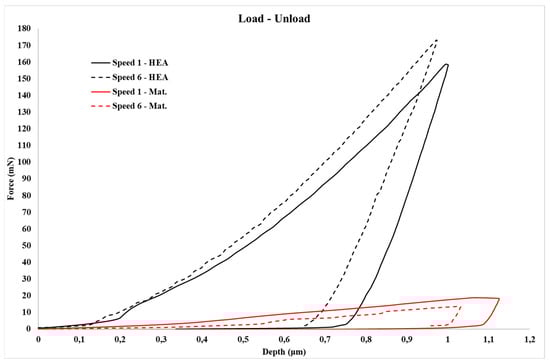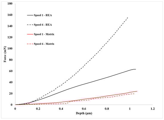 Nanoindentation load–unload cycle curves for matrix and HEA reinforcement.