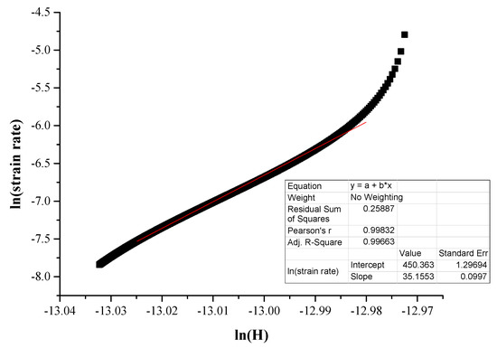 Following this equation sequence, the stress exponent n can be calculated by plotting , i.e., with . Once the stress exponent is calculated, another important parameter, the strain rate sensitivity, m, can also be calculated by