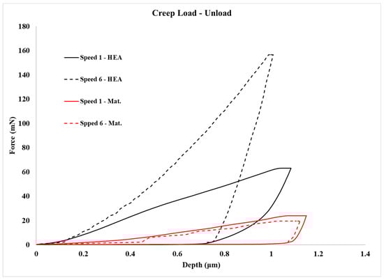 Examples of overall load–creep–unload curves are presented in Figure 13. Clearly, the previously mentioned observations on the effect of loading speed on the loads to achieve the preset depth are depicted.