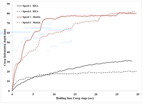 One of the most important issues before any attempt to assess the creep behaviour of both the matrix and the reinforcing phases is the examination of the loading stage prior to the actual creep stage. Figure 12 presents examples of the loading stage for the HEA reinforcement and the Al matrix. All loading curves are depicted as smooth without indications of load–depth fluctuations. In many research works [45,46,47], the presence of such fluctuations—also known as “serrations”—has been reported. Their presence is considered of significant importance as they are associated with the manifestation of micro-creep phenomena during loading and prior to the net/pure creep stage. As such, if present, they affect the material creep behaviour during the actual creep stage. In the present effort—and as Figure 12 depicts—such “serrations” do not exist. This absence shows that the dislocations, which are either primarily present in the microstructural phases from the manufacturing stage and/or generated during the loading stage, do not exert extensive mobility that could cause even limited/marginal creep deformation during the loading stage. It is also evident from Figure 12 that the different loading speeds do not seem affect the presence of absence of such load–depth fluctuations.