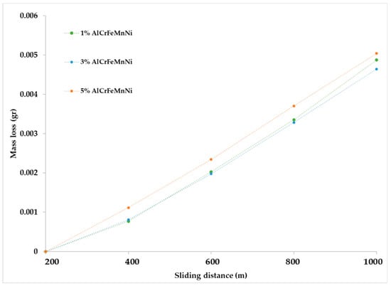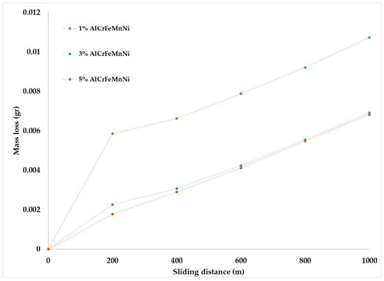 Tribological behaviour is one of the most researched responses of the MMCs. Many different key parameters such as applied load, sliding distance, sliding speed, reinforcement particles, matrix etc., have been reviewed by different researchers. Different wear mechanisms have been proposed either individually or in combination in order to evaluate the involved wear mechanisms. All these years of extensive study have led to the conclusion that the sliding wear response of AMCs is regulated by a transition between three modes, namely “light”, “mild”, and “severe” [22,23,24]. The most common mechanisms involve (i) the delamination theory of Suh where material loss is caused by crack/flaw formation and propagation as a result of plastic deformation [25], (ii) the basic Archard hypothesis, according to which material removal involves an extensive and repetitive adhesion–decohesion process of the two counter bodies and (iii) the tribolayer approach, in which surface-formed oxide phases are mechanically mixed with the metallic matrix to form a dynamic surface layer that is continuously subjected to a comminution–consolidation action, the stability of which regulates the severity of the degradation phenomena [23,26,27].