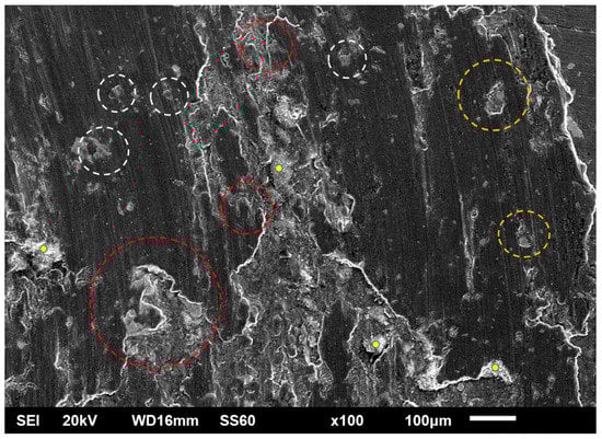 Furthermore, the role of the reinforcing particles and the oxidation phenomena in the overall wear sequence are shown in Figure 22. Certain specific areas of interest are indicated: (i) yellow marks showing extensively oxidised areas that eventually detach by the surface, (ii) white circles indicating reinforcing particles where initially formed cracks vertical to the sliding direction are stopped from being propagated, (iii) yellow circles indicating areas of removed reinforcing particles (a possible mechanism of material removal can be as follows: a crack has approached the particle without transpassing it and, on the contrary, the crack was developed circumferentially to the particle-matrix interface, leading eventually to the removal of flake-like debris with this action, however, causing the delay of the material removal sequence) and (iv) large reinforcing particles located at the contour of the ridge of large removed flake debris. Their presence shows their beneficial action in retarding the degradation process.