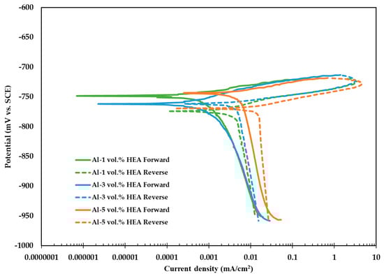 Potentiodynamic polarisation curves for Al-HEA composites (1–5 vol.%) in 3.5 wt.% NaCl solution (RT).