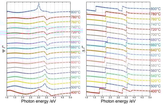 The SE measurements were performed using an M-2000 ellipsometer from J.A. Woollam CO., (Lincoln, NE, USA). The spectra were taken in the range of 0.7 eV to 5 eV with angles of incidence from 45° to 75° with a step of 5°. The acquisition time for each spectrum was 20 s. A focused beam probe was used to achieve a better lateral resolution of approximately 200 μm. Four samples were randomly chosen from each sample batch with the same annealing temperature for the multi-sample analysis. Each sample was measured once in the middle of the substrate. CompleteEASE software https://www.jawoollam.com/ellipsometry-software/completeease, accessed on 30 July 2023) was used for data processing.