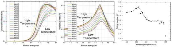 The refractive indices, extinction coefficients, and optical bandgaps of the TiO2 thin films annealed at different temperatures are shown in Figure 3. The optical bandgaps were derived by taking the intercept on the abscissa of a linear fit of , as proposed by Cody et al. [107]. represents the absorption coefficient, which was calculated using the extinction coefficient, , using the formula .