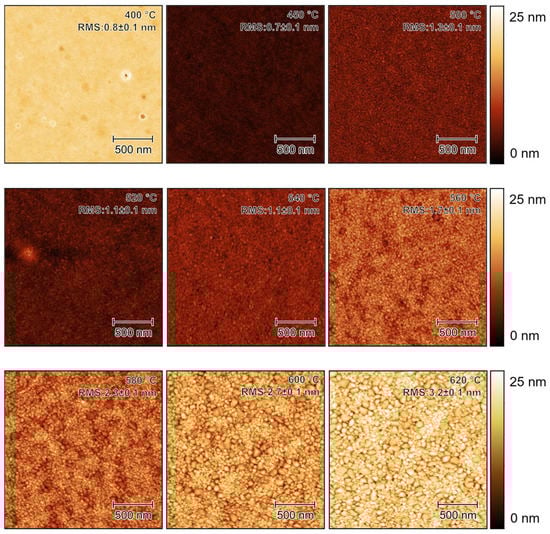 Typical AFM images of TiO2 thin films annealed at different temperatures. RMS roughness values are shown in individual images. For better visuality, different height scales are shared at the end of each line with the three images that are in the same line. The scale bar in all images is 500 nm.
