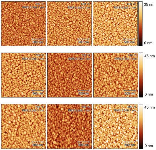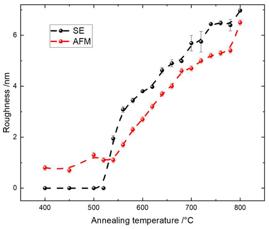 The same trend in the surface roughness was observed using SE. The SE roughness was calculated based on the optical model, which included a roughness layer using the Bruggeman effective media approximation (EMA) [110]. This EMA approach simulates roughness as a layer consisting of a material-to-void ratio of 50% to 50%. Such an estimation usually performs well when the size of the surface roughness is much less than the wavelength of the light used for the analysis [111]. Usually, the surface roughness measured by AFM is less than the roughness measured by SE [112,113,114]. Our results (Figure 5) confirm this fact, especially in the annealing temperature range from 520 °C to 800 °C. There is an exception when the roughness is very low, as observed for the temperature range between 400 °C and 520 °C. In this range, adding the roughness layer in the SE data analysis as a fitting parameter did not produce any improvement compared with the model where a roughness layer was not considered. Therefore, modeling was performed considering zero roughness as a robust estimation for the real structure of the thin film samples. We can see that the AFM roughness increased almost linearly, especially in the range where the phase transfer occurred from 540 °C to 640 °C, while the SE roughness did not exactly follow a same trend. This difference could have originated from the approaches used to obtain these two types of roughness. The AFM roughness was directly measured on the surface and was thus more sensitive to any phase-transformation-induced change in the morphology. Such phase transformation is confirmed by other characteristic methods. The SE roughness, however, was simulated indirectly via an optical model and thus was influenced by the surface optical response to the polarization. This simulation depended not only on its morphology, but also on the optical properties related to the crystal structure and thin film compactness.