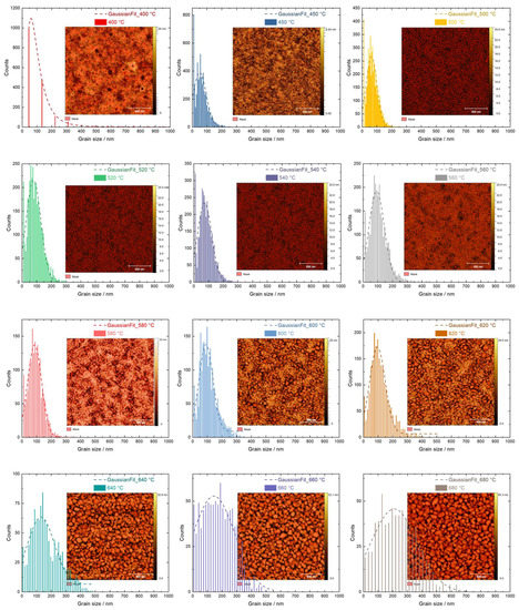 From Figure 4, we can clearly see that the grain sizes varied with increasing annealing temperatures. Statistical histograms of the grain sizes represented by the projected boundary lengths are shown in Figure 6 [95,115,116]. A Gaussian function was used to fit the histograms [117]. The insets presented in Figure 6 show the segregation results, where the definition of grains on the surface of the TiO2 thin films is represented by the red mask in each AFM image. The boundary length of each segregated area (mask in red) was considered to be the grain size for each of the samples.