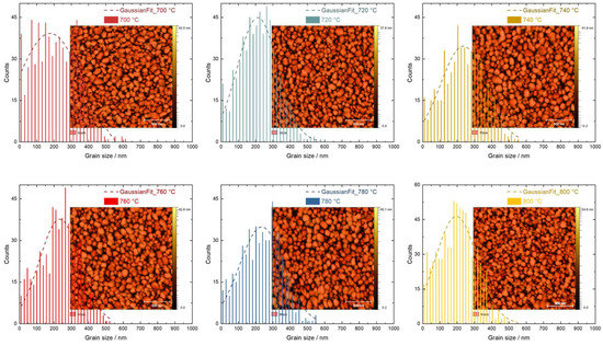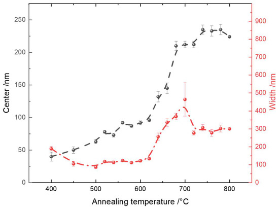 Statistical and quantitative analyses of the grain size and grain size distribution are indicated by the centroid position and the FWHM of the Gaussian profiles presented in Figure 7. The error bars were derived from the fitting process.