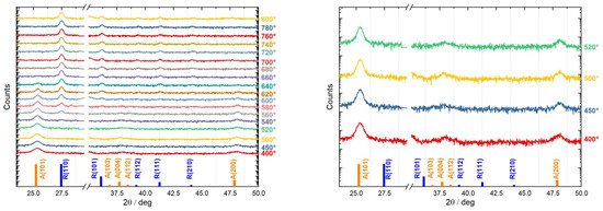 A quantitative analysis of the phase crystallinity was performed by employing the peak area and the full width at half maximum (FWHM) of the representative peaks of anatase at 25.35° and rutile at 27.47° in Figure 9 [123,124]. In the annealing temperature range from 400 °C to 520 °C, where only the anatase phase was found, the peak area remained almost constant while the FWHM decreased. This is attributed to the improved crystallinity of anatase when exposed to higher annealing temperatures. In the annealing temperature range from 540 °C to 640 °C, where both the anatase and rutile phases exist, we saw an increase in the peak area representing rutile and a decrease in the peak area representing anatase. This indicates that the ratio of anatase to rutile inside the thin film changed with the annealing temperature. The FWHM, on the other hand, decreased for both phases in this temperature range. The higher FWHM value for anatase, together with its lower peak area at 640 °C, indicate that the anatase crystallites deteriorated in crystallinity, while ordered rutile crystallites were formed. In addition, the error of the fitting for the FWHM dramatically increased at this temperature. In the annealing temperature range from 660 °C to 800 °C, the peak area representing rutile remained almost constant, while the FWHM slightly decreased with an ascending annealing temperature, indicating a small change in the amount of rutile with slightly increased crystallinity.
