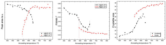 Peak analysis of XRD diffractograms with peak areas (left) and the FWHM (middle) of the representative peaks for anatase at 25.34° and rutile at 27.49°. Right: estimated crystallite sizes of anatase and rutile using the Scherrer formula.