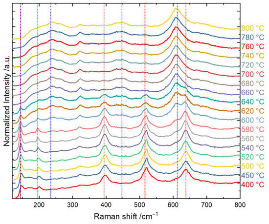 UV Raman spectra of each TiO2 thin film annealed at temperatures from 400 °C to 800 °C, where the red/blue dot-dashed lines correspond to the characteristic frequency positions of anatase/rutile vibrational modes.