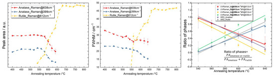 Peak area (left) and FWHM (middle) of the characteristic peaks of anatase and rutile at different annealing temperatures; the ratio of phases calculated using the Raman peak areas of different modes and compared to those obtained from the XRD data in the temperature range where anatase and rutile coexist (right).