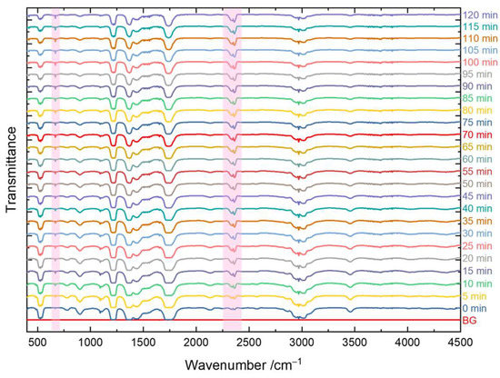Typical IR transmittance spectra of the gas mixture in the reaction chamber during the 2 h of photodegradation of acetone gas using the photocatalytic TiO2 thin films annealed at 500 °C, where the red stripe area indicates the characteristic CO2 IR features.