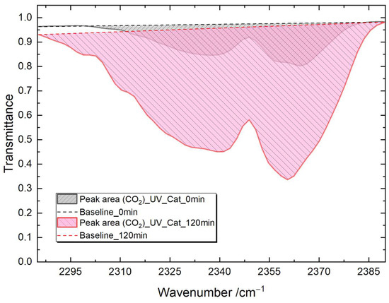 A quantitative analysis was performed using the integration of the CO2 characteristic IR feature in the transmittance spectra from 2270 to 2400 cm−1. The integrated area was fixed for all spectra. The integrated area and the baseline are shown in Figure 13. The small amount of CO2 that was already present at 0 min is due to the injection of the saturated acetone gas from the reservoir, where some CO2 was present in the air. These integrated values are a straightforward indicator of the amount of CO2 in the reaction chamber. Therefore, the difference in such values was then used to represent the effectiveness of the photocatalytic process for TiO2 thin films annealed at different temperatures.