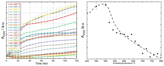 Production of CO2 normalized to the microscopic surface area of the TiO2 thin films annealed at different temperatures (left); the production of CO2 after 120 min using different TiO2 thin films, where the dashed line is used as a guide for the eyes (right).