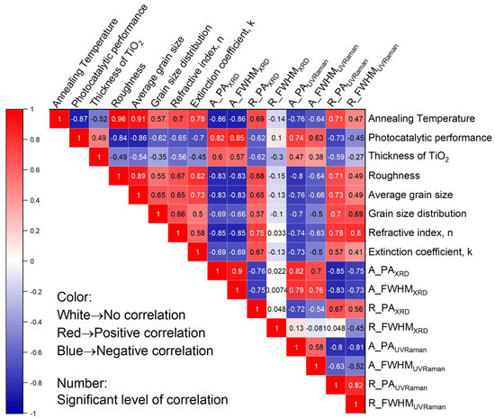 All parameters influencing the photocatalytic performance were quantified and related to each other using a correlation matrix. This matrix provided an overview of the annealing temperature’s effect on the photocatalytic performance of titanium dioxide.