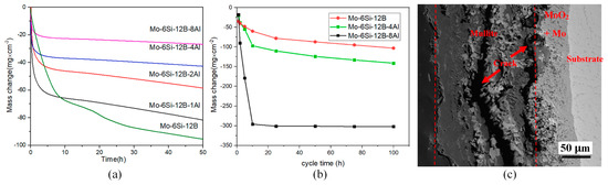 - Paswan, S.; Mitra, R.; Roy, S. Nonisothermal and Cyclic Oxidation Behavior of Mo–Si–B and Mo–Si–B-Al Alloys. Metall. Mater. Trans. A 2009, 40, 2644–2658. [Google Scholar] [CrossRef]