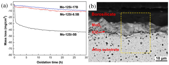 - Wang, J.; Li, B.; Li, R.; Wang, T.; Chen, X.; Zhang, G. Improved Oxidation Resistance of Mo-12Si-8.5B Composite at 1400 °C Due to Development of Zr-Rich Borosilicate Scale. Ceram. Int. 2019, 45, 3111–3117. [Google Scholar] [CrossRef]