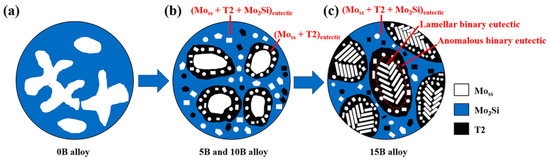 - Takata, N.; Sekido, N.; Takeyama, M.; Perepezko, J.H.; Follett-Figueroa, M.; Zhang, C. Solidification of Bcc/T1/T2 Three-Phase Microstructure in Mo-Nb-Si-B Alloys. Intermetallics 2016, 72, 1–8. [Google Scholar] [CrossRef]