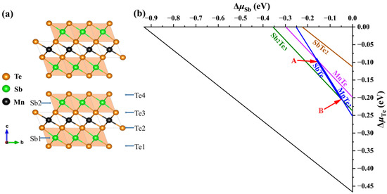 The calculated formation enthalpy of MnSb2Te4 and MnTe2 + 2SbTe → MnSb2Te4 is close to −0.5 meV. Since its enthalpy is close to 0, the two-phase boundary between ternary phases (MnSb2Te4) and binary secondary phases (MnTe2 and SbTe) will be close. We consider various competing binary compounds, such as MnTe2, SbTe, etc. In the phase diagram displayed in Figure 1a,b, the polygon of the chemical potential range calculated under the condition of thermal equilibrium is represented by a thick line segment.