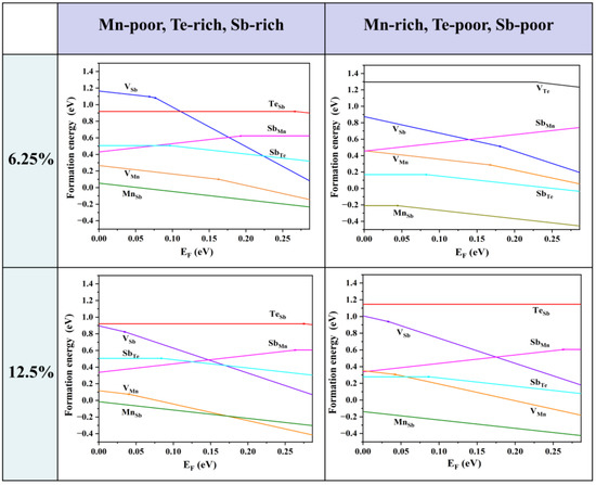 As the Fermi level is located near the VBM, the formation energy near the VBM is taken into account for comparison. The formation energies of the Mn antisite defects are always low, no matter if under Te-poor or Te-rich conditions, indicating that MnSb is the most abundant intrinsic defect in MnSb2Te4. SbMn is the most stable donor, while VMn, VSb, and MnSb are acceptors. Importantly, the formation energy of the Mn antisite defect is negative at low concentrations (<6.25%), indicating the spontaneous formation of the defect in pristine systems, which is consistent with theoretical results in the literature [15]. The formation energy of MnSb at 12.5% (−0.01 eV) is greater than the formation energy at 6.25% (−0.17 eV). Therefore, it is expected that the formation energy of MnSb increases as the concentration increases and turns into positive values beyond a certain concentration.