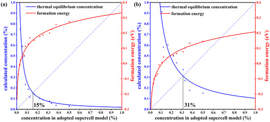 where ND is the concentration of available atomic sites for defect formation, ΔHf is the defect formation energy, kB is the Boltzmann constant, and T is temperature (here, the melting point of MnSb2Te4 of 918 K [17] is adopted). We calculate the defect formation energy from the concentration of a series of structures and then estimate the thermal equilibrium concentration of Mn antisite defects at Sb sites based on Equation (22). As displayed in Figure 3, Mn antisite defects at the Sb site are easier to form when the defect concentration is low but difficult to form when the concentration is high, indicating that Mn antisite defects will not accumulate forever and will reach thermal equilibrium at a certain concentration. In this way, an intersection point can be found between the concentration in an adopted supercell model and the thermodynamic equilibrium concentration, which indicates the state of thermodynamic equilibrium. From Figure 3a,b, the chemical potential greatly affects the formation of defects. The equilibrium concentration of Mn antisite defects is 15% under Mn-poor/Sb and Te-rich conditions, while its concentration is 31% under Mn-rich/Sb and Te-poor conditions, consistent with the experimental report that concentrations of Mn antisite defects are to be 15% [16] or 19.3% [17].