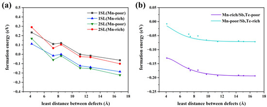 Consequently, we will discuss the influence of the defect distribution on the defect formation energy. In Figure 4b, the relationship between the various distributions of Mn antisite defects at a 6.25% concentration and formation energy is displayed. The larger the distance between the defects, the lower the formation energy, whether in Mn-poor or Mn-rich conditions, revealing a tendency for Mn antisite defects to be uniformly in MnSb2Te4. When the nearest neighbor distance reaches 12 Å, the defect formation energy, tends to converge. Additionally, various supercell models at 1SL and 2SLs MnSb2Te4 with only one defect are calculated to facilitate the comparison of defect distribution (Figure 4a). The formation energy decreases as the distance to the nearest neighbor increases, in line with the above observation. In Figure 4b, the variation of formation energy is small in the case where only the influence of defect distribution is considered. For example, under Mn-poor conditions, the defect formation energy only decreases from −0.02 eV to −0.06 eV, which is much smaller than the case in Figure 4a. As a result, concentration has a more significant impact than distribution on the formation energy of defects.