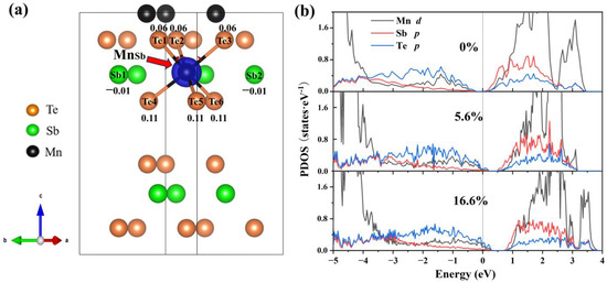 Differential charge density and projected density of states (PDOS) of MnSb2Te4. (a) The differential charge density of MnSb2Te4 with a 16.6% Mn antisite defect. The blue color represents charge depletion. The value around atoms represents the number of electrons obtained by the atom. The positive and negative values represent charge depletion and charge accumulation, respectively. Projected density of states (PDOS) of MnSb2Te4 with Mn antisite defects at different concentrations of (b) 0%, 5.6% and 16.6%.