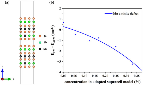 Through the above discussion, the Mn antisite defect can reach an equilibrium state within a concentration range of 15–31%. Next, we calculate the effect of these defects on the interlayer coupling with different supercell sizes in slab models. In 2SLs MnSb2Te4, there are two defects in each supercell (e.g., Figure 6a). As displayed in Figure 6b, Mn antisite defects can tune the MnSb2Te4 interlayer coupling from an ideal AFM state to an FM state. The FM interlayer coupling is enhanced with increasing concentrations. When the concentration of Mn antisite defects reaches 33%, the energy difference between the FM state and the AFM state is up to −3.2 meV/Mn. Our results demonstrate that Mn antisite defects can induce a transition in interlayer magnetic coupling, which has been mentioned in previous experiments [16,34] in that Mn-Sb site mixing can cause such transitions. In contrast to previous studies, our research focuses more on whether individual Mn antisite defects alone can induce this magnetic phase transition. This confirms that Mn antisite defects correspond to the observation of FM states in MnSb2Te4.