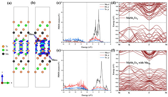 Next, we analyze the internal mechanism of this ferromagnetic coupling. The differential charge density is displayed in the case of no defects and in the case of Mn antisite defects, as shown in Figure 7a,b. In the absence of defects, the charge distribution in the layered structure of MnSb2Te4 is relatively symmetrical, and the charge distribution in the upper SL and the lower SL in 2SLs is almost consistent. However, in the case of Mn antisite defects, the charge concentrates near Mn and is greatly changed in the lower and upper SLs. The charge distribution caused by Mn antisite defects leads to a change in the orbital occupation states of Mn and Te. Figure 7c–f displays the densities of state and band structure for pristine 2SLs MnSb2Te4 and 2SLs MnSb2Te4, respectively, at the concentration of Mn antisite defects of 12.5%. The peak of the p orbital of Te atoms gradually approaches the Fermi level with Mn antisite defects, while the peaks of the d orbitals of Mn atoms also shift right. This indirectly indicates that the interlayer ferromagnetism is related to Te-Mn-Te superexchange interactions. Comparing 2SLs MnSb2Te4 and 2SLs MnSb2Te4 with Mn antisite defects in the slab model, we conclude Mn antisite defects exhibit a deep acceptor behavior, which is consistent with the case of the bulk system.