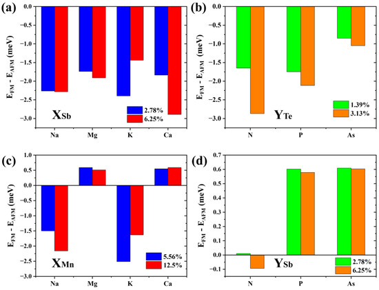 The energy differences between interlayer ferromagnetic and interlayer antiferromagnetic states in (a) Na/Mg/K/Ca doped 2SLs MnSb2Te4 at concentrations of 2.78% and 6.25%; (b) N/P/As doped 2SLs MnSb2Te4 at concentrations of 1.39% and 3.13%, (c) Na/Mg/K/Ca doped 2SLs MnSb2Te4 at concentrations of 5.56% and 12.5%; and (d) N/P/As doped 2SLs MnSb2Te4 at concentrations of 2.78% and 6.25%. X and Y represent Na/Mg/K/Ca and N/P/As, respectively.