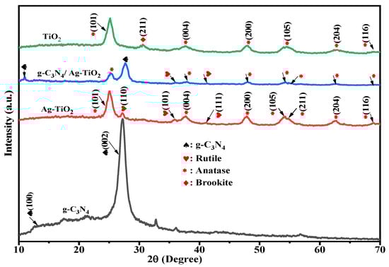 The crystal structures of the as-prepared samples, including pristine TiO2, Ag–TiO2, g-C3N4, and g-C3N4/Ag–TiO2, were investigated using X-ray powder diffraction (XRD), and the results are shown in Figure 1. The XRD patterns of g-C3N4 revealed the presence of two characteristic peaks at around 13.1° (100) and 27.2° (002), which correspond to in-plane repeating tri-s-triazine units and interplanar stacking of conjugated aromatic units, respectively [6,48]. The absence of a characteristic Ag peak in the composites, as confirmed by the XRD spectra, can be attributed to the low amount of Ag or its high dispersion [38,41,42]. The diffraction peaks of pristine TiO2 and Ag–TiO2 nanoparticles are predominantly in the anatase phase (ICSD File No. 076173) and located at 2θ positions of around 25.356° (101), 37.847° (004), 48.145° (200), 53.974° (105), 55.186° (211), 62.812° (204), and 68.879° (116). In addition to the characteristic anatase phase peaks, the Ag–TiO2 nanoparticles also exhibited a rutile phase, with diffraction peaks located at 2θ of 27.4392° (110), 306.0847° (101), and 3541.2744° (111) (ICSD File No. 088627). The pristine TiO2 sample was primarily composed of the anatase phase, with a minor brookite phase at 2θ of 30.68°, corresponding to the (121) crystal plane, which indicated consistency with previous findings [49]. The XRD patterns of the g-C3N4/Ag–TiO2 nanocomposite contained diffraction peaks arising from both Ag–TiO2 and g-C3N4, thereby confirming the successful formation of the composite. Moreover, a higher g-C3N4 content was found to be capable of intensifying the recognizable peak at approximately 27.6°, resulting in a minor peak position shift in the composite [11]. Both anatase and rutile TiO2 diffraction peaks were observed for the g-C3N4/Ag–TiO2 composite [42,50].