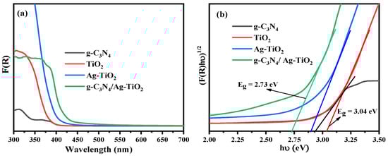 As shown in Figure 2b, the bandgap energies of the Ag–TiO2 and g-C3N4/Ag–TiO2 composites are narrower than those of the pristine TiO2 and g-C3N4 samples. The absorption edges of the g-C3N4/Ag–TiO2 nanocomposite exhibited a considerable redshift toward higher wavelengths, indicating a significant improvement in the visible light absorption of the composites, as shown in Figure 2a [11,50]. This may be due to the surface plasmon resonance effect of Ag, which is deposited on the surface of the TiO2 nanoparticles, and the formation of heterostructures in the composites [17]. The bandgap energy (Eg) of the as-synthesized samples was calculated using a modified Tauc equation with the Kubelka–Munk function: