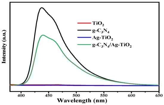 Photoluminescence (PL) analysis was used to study the separation of photoinduced electron–hole pairs in the as-synthesized samples [43]. Figure 3 shows the PL spectra of pristine TiO2, Ag–TiO2, g-C3N4, and g-C3N4/Ag–TiO2 samples obtained at an excitation wavelength of 360 nm. Both g-C3N4 and g-C3N4/Ag–TiO2 displayed main emission peaks at approximately 440 nm, as shown in Figure 3. A higher PL intensity was observed for g-C3N4 compared to g-C3N4/Ag–TiO2, indicating faster recombination of photoinduced electron–hole pairs in g-C3N4 [36]. The PL spectra of pristine TiO2 and Ag–TiO2 nanoparticles did not exhibit any significant emission peaks, indicating that they had a lower rate of recombination of photogenerated electron–hole pairs [50]. The reduced PL emission peak of the g-C3N4/Ag–TiO2 composite compared to g-C3N4 can be attributed to a lower rate of recombination of photogenerated electron–hole pairs, which may be due to the formation of a heterostructure between g-C3N4 and Ag–TiO2 [42,43].