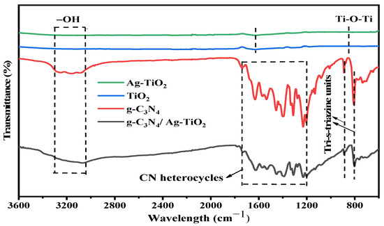 The broad peaks appearing at 3300–3000 cm−1 are due to the stretching vibrations of the O–H group on the TiO2 surface [19,54]. The peak located around 1626 cm−1 is due to bending vibrations resulting from chemically adsorbed H2O molecules [18]. The stretching vibrations of Ti–O and Ti–O–Ti exhibited by the TiO2 nanoparticles were observed at around 850 cm−1 [11,19,55]. The peaks at 1216, 1366, 1438, and 1738 cm−1 correspond to the carbonyl (C=O) mode. The peak observed at 1180 cm−1 corresponds to the stretching vibrations of the Ti–OH molecule [13]. In the g-C3N4/Ag–TiO2 sample, characteristic peaks attributed to both TiO2 and g-C3N4 were observed, confirming the presence of both materials in the composite sample [11,21].