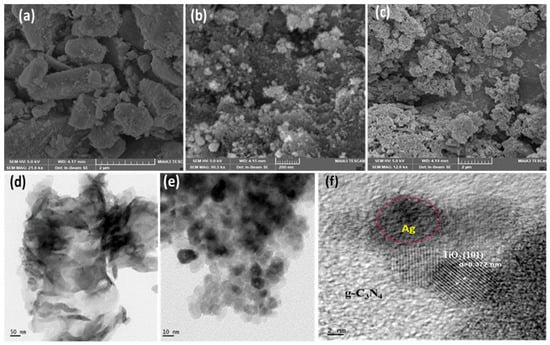 The SEM micrograph of pristine TiO2 nanoparticles exhibits irregularly shaped agglomerates, as shown in Figure 5a. The SEM and TEM images of Ag-doped TiO2 nanoparticles are shown in Figure 5b,e, respectively. In Figure 5b, the SEM image depicts the agglomeration-induced formation of a cluster of Ag–TiO2 nanoparticles and the homogeneous distribution of spherical Ag–TiO2 nanoparticles [56,57]. The presence of small Ag0 islands on the surface of Ag-doped TiO2 nanoparticles is clearly observed in the TEM image, as shown in Figure 5e [58]. The SEM image shows significant adhesion between the Ag–TiO2 nanoparticles and the g-C3N4 nanosheet, indicating a strong interface between the two constituents of the composite, as shown in Figure 5c. Notably, the presence of g-C3N4 improves the dispersion of TiO2 nanoparticles by preventing their agglomeration [11].
