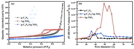 Based on the N2 adsorption–desorption isotherms, all synthesized photocatalysts exhibited typical IV isotherms of mesoporous materials with H1, H2, and H3 hysteresis loops for g-C3N4, Ag–TiO2, and g-C3N4/Ag–TiO2, respectively, as shown in Figure 6a [17,21,43]. The specific surface area of Ag–TiO2 nanoparticles increased slightly because of the incorporation of Ag nanoparticles. However, the pore volume of Ag–TiO2 is not as high as its BET surface area because the Ag nanoparticles tend to block the pores in TiO2. Moreover, the surface area of the composite slightly decreased with the coupling of Ag–TiO2 to g-C3N4, potentially owing to the covering and blocking of the surface-active sites of Ag–TiO2 by g-C3N4 [21]. However, the excellent photocatalytic degradation efficiency of the g-C3N4/Ag–TiO2 nanocomposite might not be underestimated owing to the small specific surface area. In addition, the excellent photocatalytic performance of the composite is a consequence of a combination of factors such as the extended visible light absorption range, enhanced crystallite size, and reduced recombination of charge carriers owing to its narrowed bandgap energy [15]. Previous studies have reported that g-C3N4/Ag–TiO2 nanocomposites exhibit excellent photocatalytic performance despite having a smaller surface area than their constituent components [60].