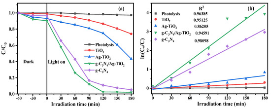 A pseudo-first-order kinetic model was utilized to determine the apparent degradation rate constant (kapp) of RhB dye over g-C3N4/Ag–TiO2 composites [11,47]: