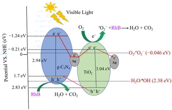 Ag deposited on TiO2 in g-C3N4/Ag–TiO2 nanocomposites acts as a bridge for electron conduction, resulting in improved separation of electron–hole pairs on g-C3N4 through the generation of a Schottky barrier between Ag nanoparticles and TiO2 [17,38]. In addition, due to the surface plasma resonance effect, Ag nanoparticles in heterostructured g-C3N4/Ag–TiO2 nanocomposites can be photoexcited, producing electrons that migrate to the conduction band of TiO2 [48]. The transfer of excess electrons from the conduction band of TiO2 to Ag nanoparticles in heterostructured g-C3N4/Ag–TiO2 nanocomposites reduces the recombination of photoinduced charge carriers [15]. The incorporation of Ag nanoparticles, in addition to the excellent heterostructure formation between TiO2 and g-C3N4, results in excellent photocatalytic degradation efficiency of RhB [17,38]. Moreover, the close interfacial connections between Ag–TiO2 and g-C3N4 allow for efficient electron migration and spatial separation of electrons and holes, retarding their recombination rate and thereby improving photoactivity [60].