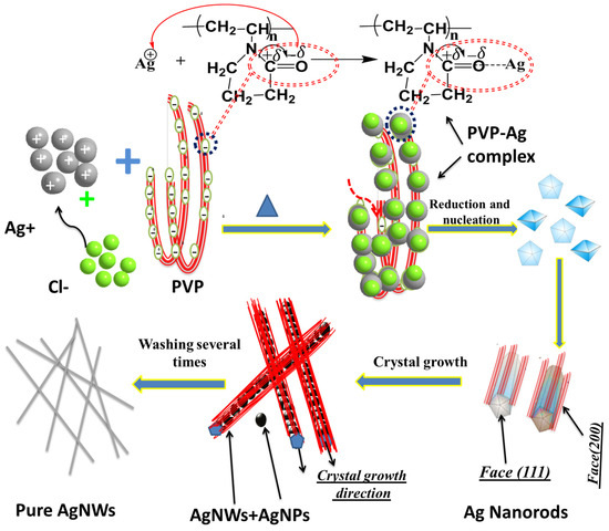 PVP works as a good capping agent, and it plays a significant role in the final morphological shape of the silver nanostructure [5,32]. PVP has a high ability to form coordination bonds with many chemical compounds. The coordination properties are due to the skeleton of PVP which has a strong polar group (pyrrolidone ring). Carbonyl polar groups (C=O) were coordinated with Ag+ ions to form the PVP-Ag complex, as shown in Figure 1. Ag+ ions were absorbed on the active sites of the PVP polymer surface, and then Ag ions were converted to nuclei of AgNWs [30].