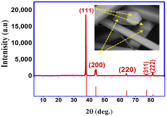 The XRD spectrum with the reference pattern of AgNWs synthesized by the one-step polyol method and its corresponding SEM image.