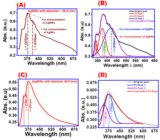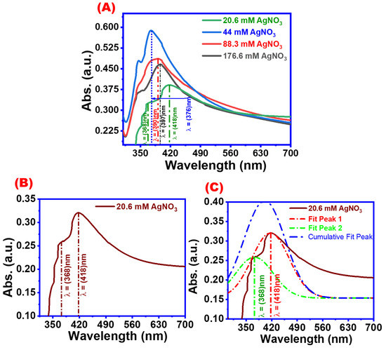The UV-absorbance spectra of AgNWs synthesized with different AgNO3 concentrations are shown in Figure 7. Five characteristic UV absorbance peaks were observed at 368, 376, 390, 397, and 410 nm which correspond to AgNWs synthesized with four different AgNO3 concentrations. The first three peaks were attributed to AgNWs with average diameters of 270, 137, and 49.87 nm which were prepared under 176.6, 88.3, and 44 mM of AgNO3 concentrations, respectively. The two other peaks of the characterized AgNWs had an average diameter of 25.43 nm. Based on these data, with increasing the concentration of silver nitrate, the thickness of the wires increases, which leads to the emergence of UV absorption values towards a redshift (Figure 7A) [45,46]. Figure 7B,C show the UV absorbance spectra for the AgNW suspension sensitized with 20.6 mM AgNO3 and its corresponding Gaussian fitting, respectively. Two UV absorbance peaks were observed at 368 and 418 nm, which were assigned to the thinner AgNWs and AgNPs, respectively [40]. Very thin AgNWs can be obtained by using a low concentration of AgNO3; however, silver nanoparticles will also be obtained as indicated by the presence of a UV peak at 418 nm. It may be concluded that using a low concentration of silver source not only will yield AgNWs with thinner diameters, but the suspension will also contain silver nanoparticles. Consequently, to obtain uniform and thin wire with a minimum amount of AgNPs, a concentration of 44 mM was applied in this study.