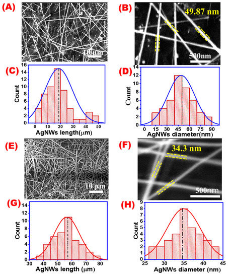 SEM images at different magnifications and their corresponding length and diameter distribution (A–D) for AgNWs prepared by the traditional polyol method; and (E–H) for AgNWs prepared by the one-step method.