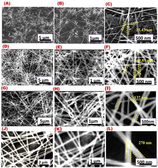 It has been reported that the morphology of Ag nanostructures obtained by the polyol method is strongly influenced by the silver source concentration [3,43,44]. Figure 5 shows SEM images of AgNWs synthesized by four different AgNO3 concentrations. A very thin wire with an average diameter of 25 nm and an average length of 8.49 μm. Additionally, a lot of nanoparticles were produced with 20.6 mM AgNO3 (Figure 5A–C). Using a higher concentration of AgNO3 produces thicker AgNWs without AgNPs (Figure 5D–L). Average diameters of 49.87, 137, and 270 nm and average lengths of 25.87, 30.37, and 39.17 μm were observed for 44, 88.3, and 176.6 mM of AgNO3, respectively.