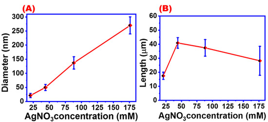 Effect of AgNO3 concentration on the (A) diameter of AgNWs and (B) length of AgNWs.