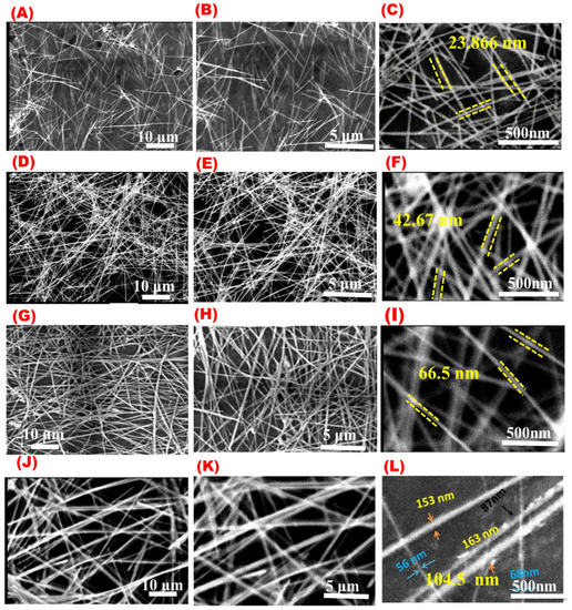 The agitation speed of chemical reactions highly affects the growth of AgNWs crystals and should be carefully adjusted [47]. Figure 8 shows SEM images of AgNWs synthesized with different agitation speeds ranging from 0 to 700 rpm. As was expected, different agitation speeds will lead to different AgNW morphologies. The average diameters of AgNWs obtained with agitation speeds of 700, 300, 100, and 0 rpm were found to be 23.866, 42.67, 66.5, and 104.5 nm, while the lengths of the wires were 16.08, 41.066, 56.86, 54.506 μm, respectively. Additionally, SEM images proved that AgNWs synthesized with controlled agitation will produce more uniform AgNWs than those obtained without agitation (Figure 8L).